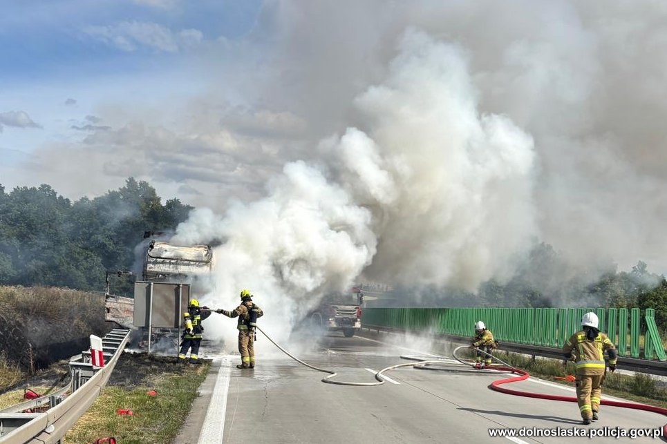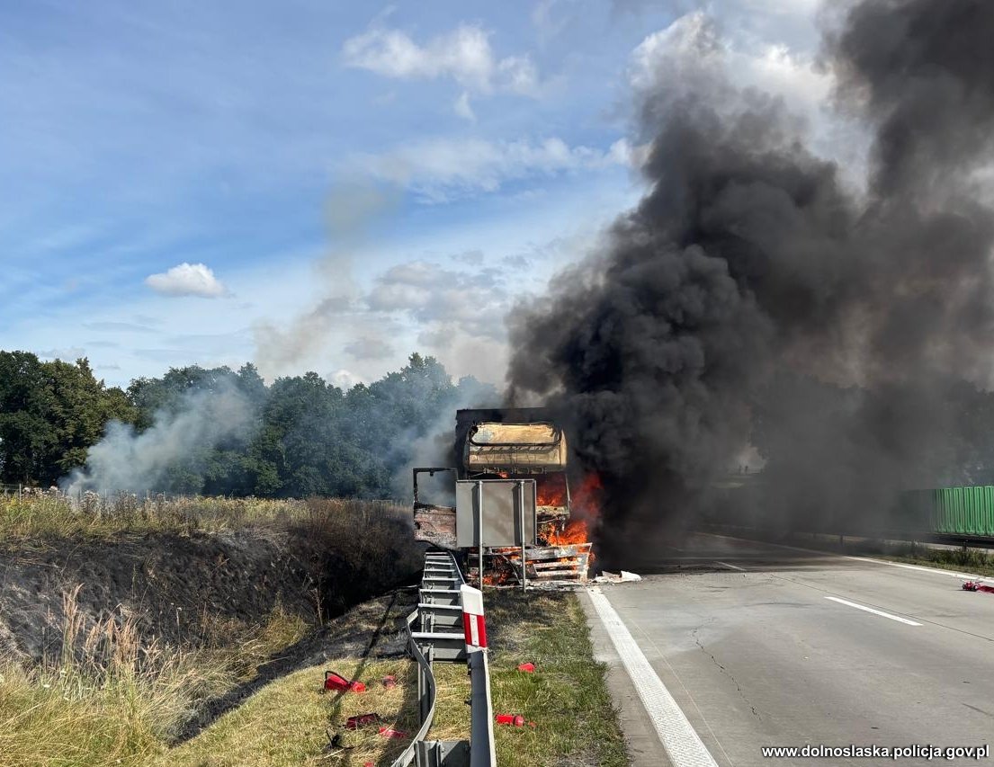 Kilka dni temu na autostradzie A4 doszło do bardzo niebezpiecznego zdarzenia, które zauważyli policjanci SPPP z Legnicy jadąc na służbę do powiatu zgorzeleckiego. Z auta ciężarowego na poboczu wydobywały się kłęby dymu i ognia, a kierowca próbował ratować swój dobytek. Mundurowi od razu podbiegli do niego, by przemieścić go w bezpieczne miejsce. Zatamowali też ruch na autostradzie w obu kierunkach i nakazali zatrzymanie nadjeżdżających aut w bezpiecznej odległości. Powiadomili swojego dyżurnego i wezwali na miejsce służby pomocowe.