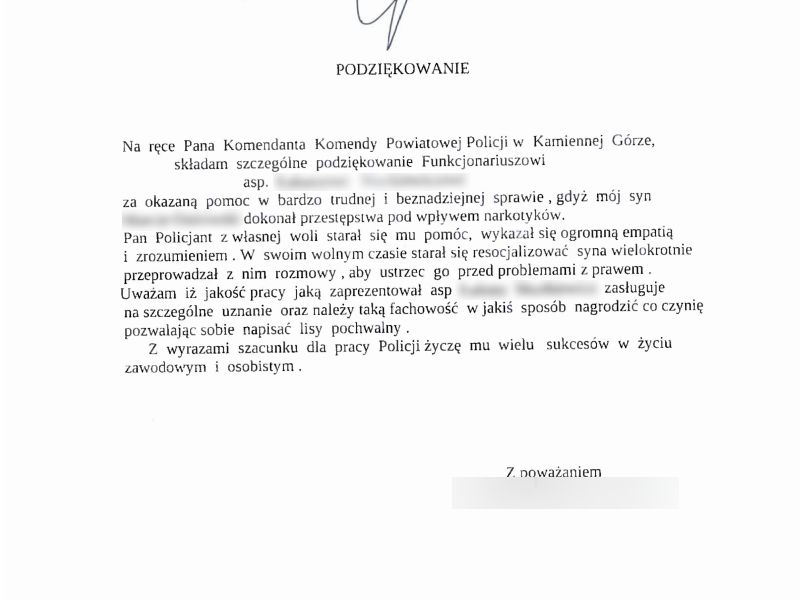 W swoim liście podkreślili, że funkcjonariusz – kierując się empatią oraz troską o los drugiego człowieka – okazał ich synowi wsparcie wykraczające poza standardowe obowiązki służbowe. Z własnej inicjatywy podejmował rozmowy wychowawcze, starając się uchronić młodego mężczyznę przed dalszymi konsekwencjami życiowych błędów. Rodzice zaznaczyli, że takie zaangażowanie i profesjonalizm zasługują na szczególne wyróżnienie, a wyrażone przez nich podziękowania są formą symbolicznego uhonorowania postawy funkcjonariusza.