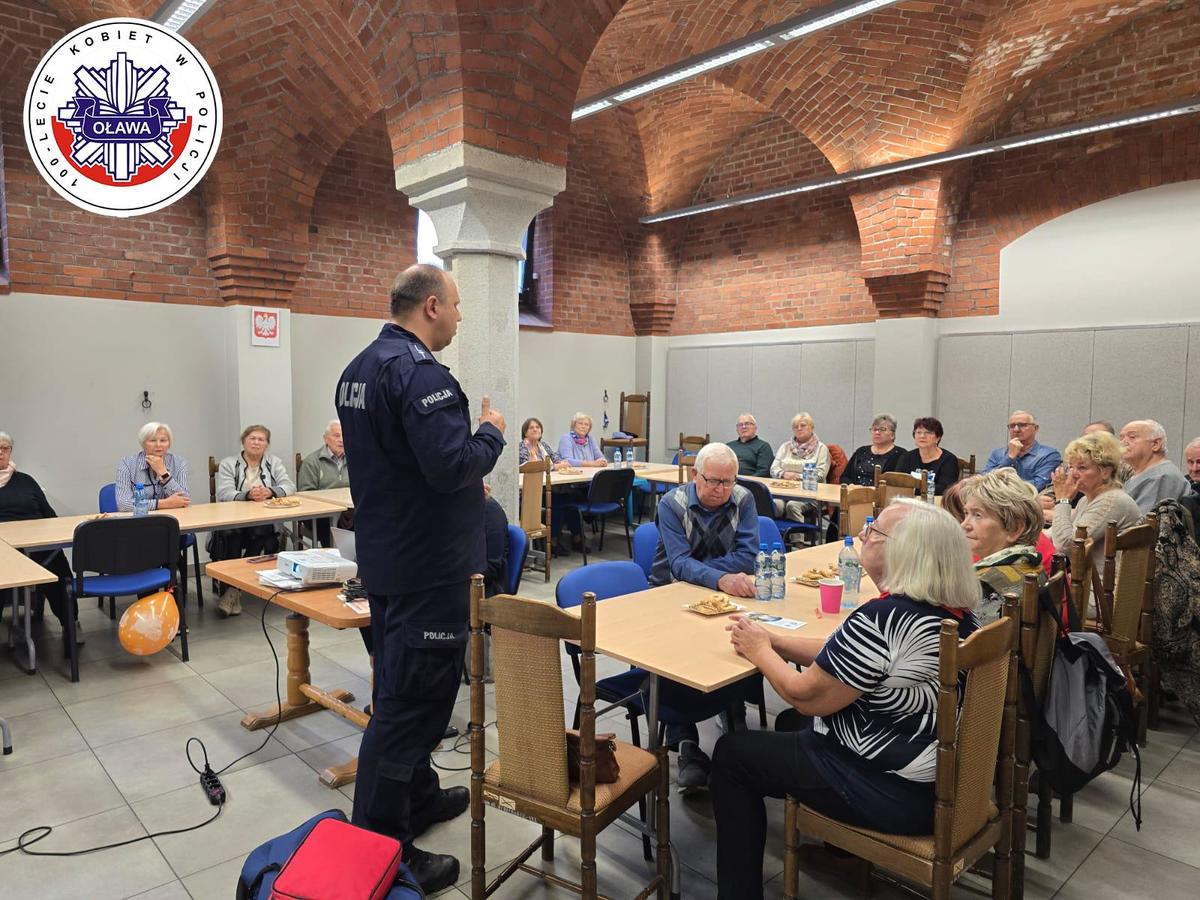 Dolnośląscy policjanci prowadzą cykliczne spotkania z seniorami, mając w szczególności na uwadze ich bezpieczeństwo. Tym razem oławscy policjanci poprowadzili spotkanie z seniorami z Polskiego Związku Emerytów, Rencistów i Inwalidów. Celem spotkania było uświadomienie seniorów o współczesnych zagrożeniach i przekazanie im wiedzy na temat różnych metod działania oszustów, jakie mogą spotkać ich w codziennym życiu. Ponadto uczestnicy szkolenia zdobyli wiedzę teoretyczną oraz praktyczną z zakresu jak rozpoznać stan zagrożenia zdrowia i życia. Jak wezwać pomoc, o czym pamiętać i jak sprawdzić stan poszkodowanego. Szkolenie było dostosowane do indywidualnych potrzeb uczestników.