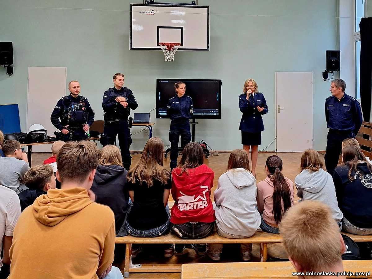W ramach obchodów Ogólnopolskiego Tygodnia Karier uczniowie klas siódmych mieli wyjątkową okazję spotkać się z funkcjonariuszami Wydziału Prewencji Komendy Wojewódzkiej Policji oraz Oddziału Prewencji Policji we Wrocławiu. Celem spotkania było przybliżenie młodzieży specyfiki pracy w Policji oraz zachęcenie do rozważenia w przyszłości wyboru tej odpowiedzialnej i satysfakcjonującej ścieżki zawodowej. Uświadomili uczniom również, że w ich wieku to doskonały moment by pomyśleć kim chcieli by zostać w przyszłości. Jeśli myślą o właściwym kierunku zawodowym w służbach, chcą się rozwijać fizycznie, psychicznie, a przy tym zdobyć ciekawe doświadczenia — nowo utworzone oddziały o profilu mundurowym w szkołach ponadpodstawowych mogą być doskonałym wyborem.
