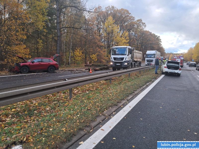 Chwilę później, na przeciwległym pasie drogi DW 333, w kierunku Polkowic, podróżująca mercedesem, zauważyła powalone drzewo na jezdni. Zdążyła bezpiecznie wyhamować, ale w tym momencie uderzył w nią kierowca peugeota. Oboje kierujący i pasażerka mercedesa trafili do szpitala. Droga w miejscu zdarzenia była chwilowo całkowicie zablokowana.