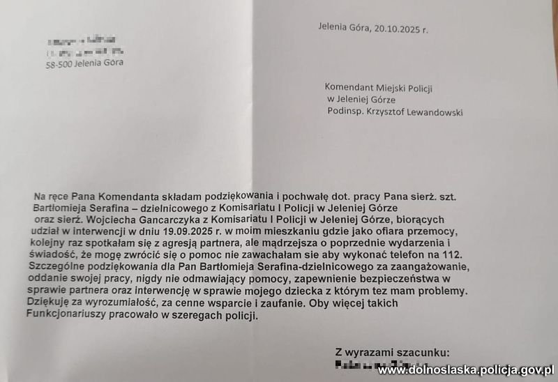 Do Komendanta Miejskiego Policji w Jeleniej Górze już po raz kolejny wpłynęły podziękowania skierowane do sierż. szt. Bartłomieja Serafina oraz sierż. Wojciecha Gancarczyka dzielnicowych Komisariatu I Policji w Jeleniej Górze. Autorka podziękowań wyraziła wdzięczność za ich profesjonalizm, empatię i wsparcie udzielone podczas interwencji domowej, do której doszło w dniu 19 września 2025 roku. Funkcjonariusze dolnośląskiej Policji niosą pomoc w różnych sytuacjach, a ponadto z chęcią angażują się w każde przedsięwzięcie mające na celu pomoc drugiemu człowiekowi. Dlatego każde miłe słowo wywołuje uśmiech na naszych twarzach i jeszcze bardziej motywuje nas do dalszej intensywnej pracy w myśl dewizy "Pomagamy i Chronimy".