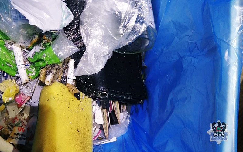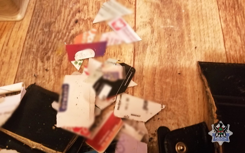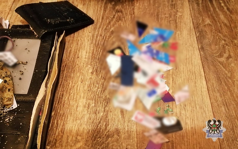 W trakcie dokładnego sprawdzenia policjanci znaleźli pod meblami woreczek z 2 tysiącami złotych pochodzącymi z kradzieży, natomiast w kuchennym pojemniku na śmieci ujawnili portfel pokrzywdzonej wraz z pociętymi dokumentami oraz kartami bankomatowymi.