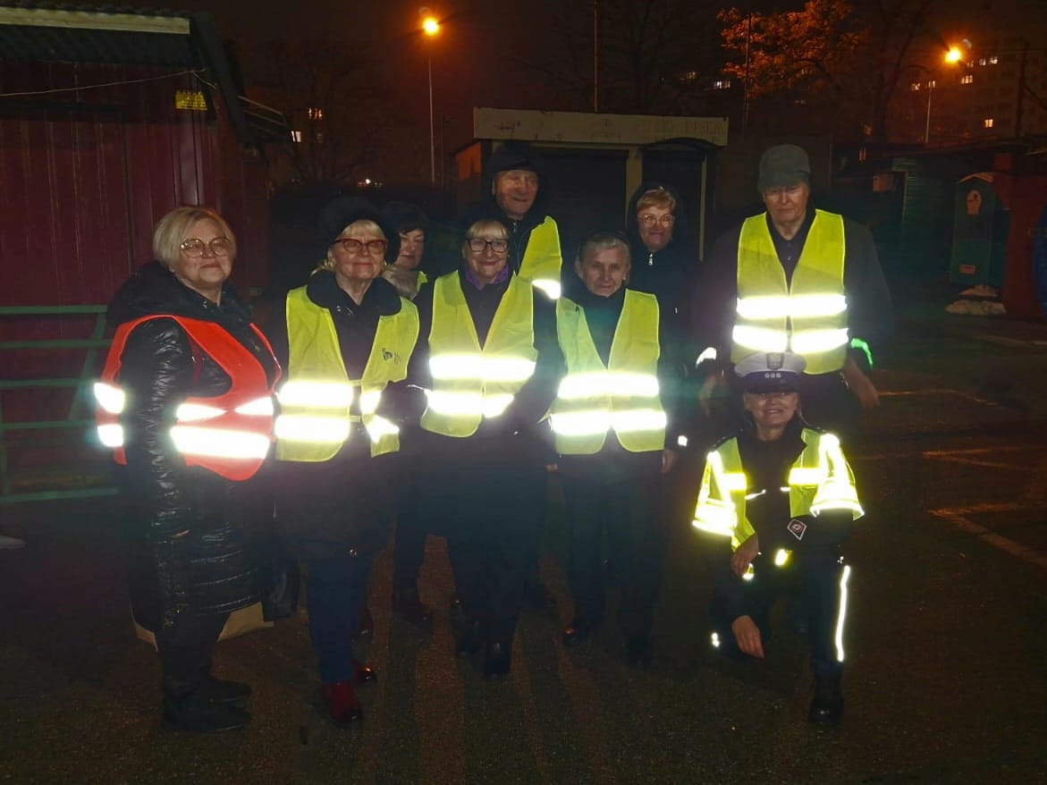 Podczas spotkania szybko zauważono, że wszyscy uczestnicy ubrani byli w ciemne kolory. To bardzo częsta sytuacja szczególnie jesienią i zimą, gdy pogoda sprzyja zakładaniu ciemnych kurtek i płaszczy. Niestety, takie ubrania powodują, że piesi stają się niemal niewidoczni dla kierujących. Dlatego st. asp. Iwona Danielewicz wyposażyła seniorów w kamizelki odblaskowe oraz zaplanowała krótkie doświadczenie obrazujące różnicę w widoczności.