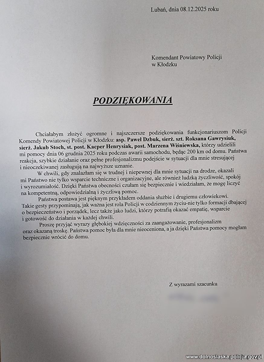 Na ręce Komendanta Powiatowego Policji w Kłodzku wpłynęły podziękowania od kobiety, która podkreśliła profesjonalizm oraz wyjątkowe zaangażowanie funkcjonariuszy : asp. Pawła Dzbuk, sierż.szt. Roksany Gawrysiuk, sierż. Jakuba Stocha, st.post. Kacpra Henrysiaka i post. Marzeny Wiśniewskiej.