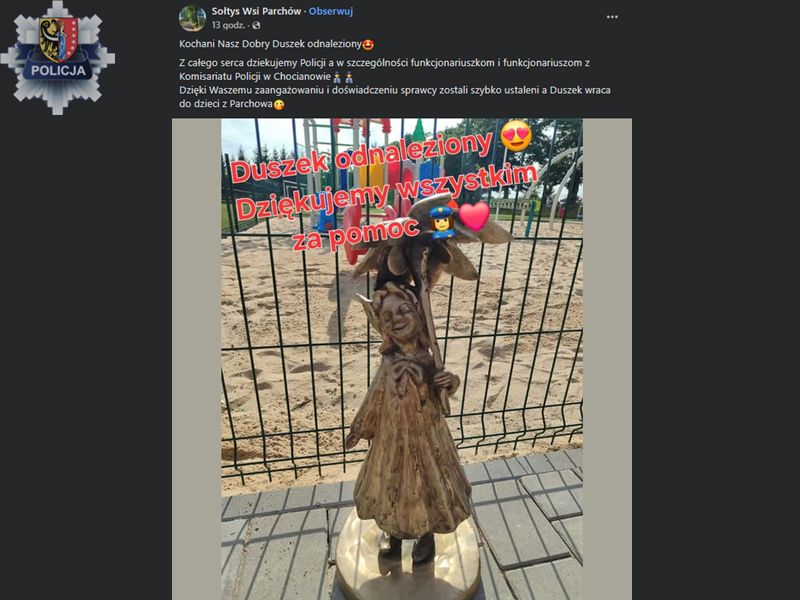 W toku wykonywanych czynności funkcjonariusze Komisariatu Policji w Chocianowie zatrzymali 29-letniego mężczyznę i jego 27-letniego wspólnika, którzy okradli pomieszczenie klubu sportowego na terenie gminy Chocianów oraz zniszczyli i ukradli figurkę „dobrego duszka”, która dotychczas zdobiła bezpośrednią okolicę placu zabaw w Parchowie. Policjanci odzyskali większość utraconego w wyniku przestępstwa mienia, w tym wspomnianą figurkę.