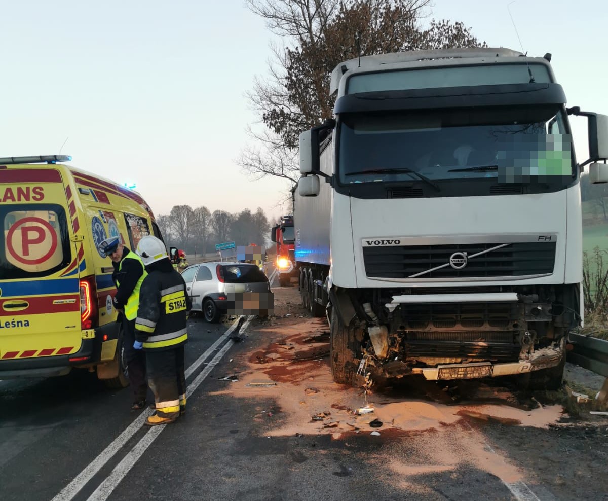 Z kolei dzisiaj 18 grudnia br. rano na terenie powiatu lubańskiego doszło do groźnego zdarzenia drogowego. Z ustaleń przeprowadzonych na miejscu zdarzenia prze policjantów ruchu drogowego wynika, że kierująca samochodem osobowym marki Opel straciła panowanie nad pojazdem w wyniku czego uderzyła czołowo w ciągnik siodłowy wraz z naczepą. W wyniku poniesionych obrażeń kierująca osobowym oplem została przetransportowana do szpitala. Droga nr 393 w Kościelniku Średnim była całkowicie zablokowana.