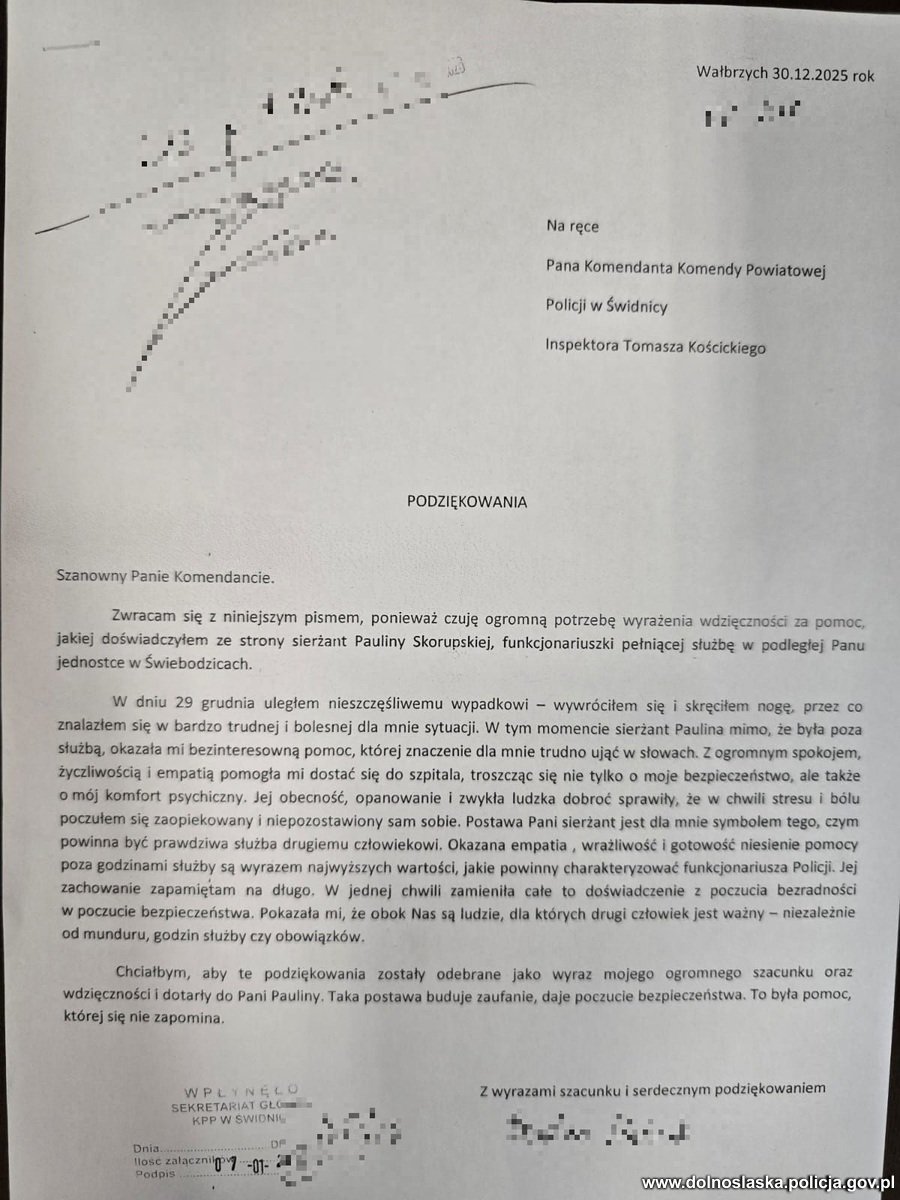 Na ręce Komendanta Powiatowego Policji w Świdnicy wpłynęły pisemne podziękowania od mężczyzny, który doświadczył tej bezinteresownej pomocy. W swoim liście wyraził on ogromną wdzięczność oraz szacunek za empatię, odpowiedzialność i ludzką życzliwość okazane w trudnej chwili.