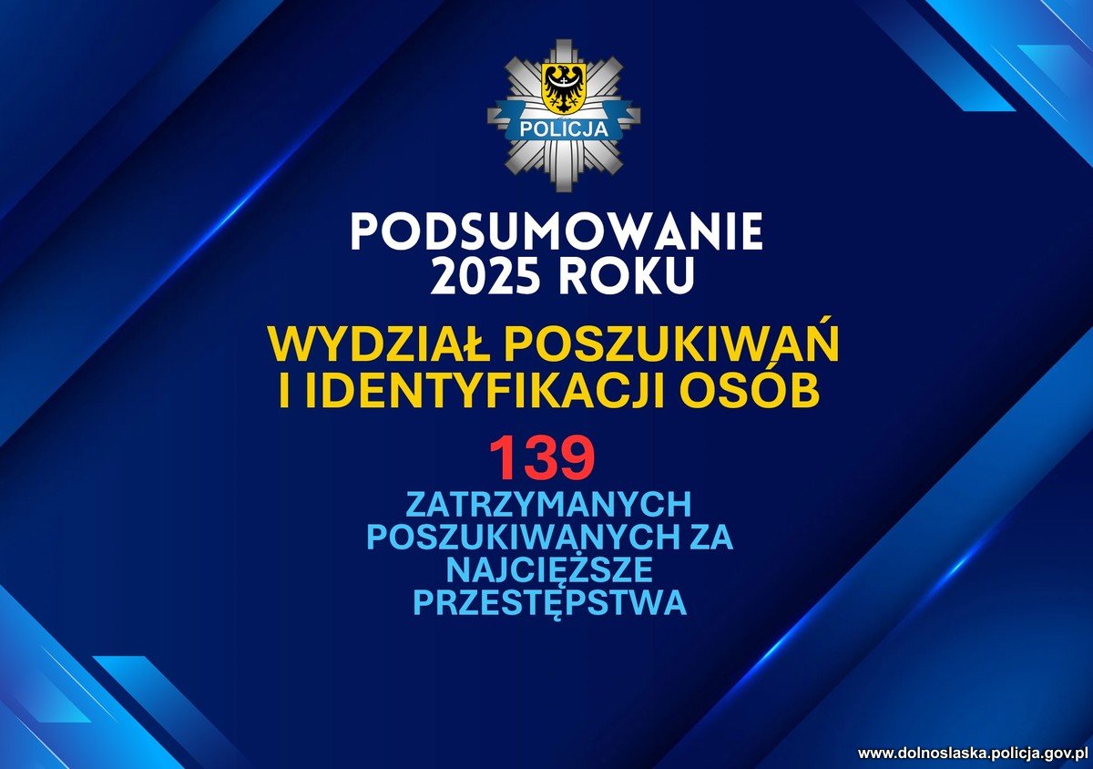 Funkcjonariusze Wydziału Poszukiwań i Identyfikacji Osób Komendy Wojewódzkiej Policji we Wrocławiu w ramach realizacji swoich zadań prowadzą poszukiwania osób ukrywających się za najcięższe przestępstwa występujące w polskim kodeksie karnym i nie tylko. Zajmują się oni również namierzaniem osób poszukiwanych przez kolegów - mundurowych z innych krajów. W 2025 roku skutecznie doprowadzili do zakończenia 139 spraw. Wśród zatrzymanych są osoby poszukiwane między innymi za zabójstwa, kierowanie zorganizowanymi grupami przestępczymi czy też przestępstwa na tle seksualnym wobec małoletnich.