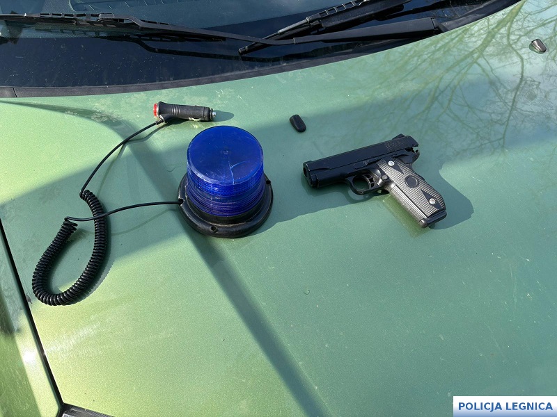 34-latek znajdował się również pod wpływem metamfetaminy, co potwierdziło badanie narkotestem. Dodatkowo ustalono, że tablice rejestracyjne zamontowane na pojeździe nie należały do tego samochodu, a sam pojazd nie był dopuszczony do ruchu. W pojeździe ujawniono m.in. replikę broni oraz urządzenie mogące służyć do podszywania się pod pojazd uprzywilejowany. Przedmioty zostały zabezpieczone do dalszych czynności.
