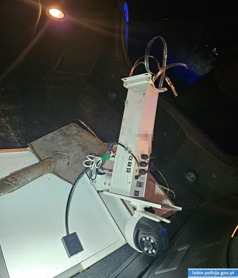 Policjanci nie dając wiary tłumaczeniom 33-latka, sprawdzili jego samochód. W bagażniku auta ujawnili kamerę wraz z panelem solarnym. Urządzenie miało obcięte przewody zasilające, a zaciski montażowe były rozerwane. Dodatkowo pod siedzeniem pasażera funkcjonariusze ujawnili narzędzia, między innymi łopatę i łom.