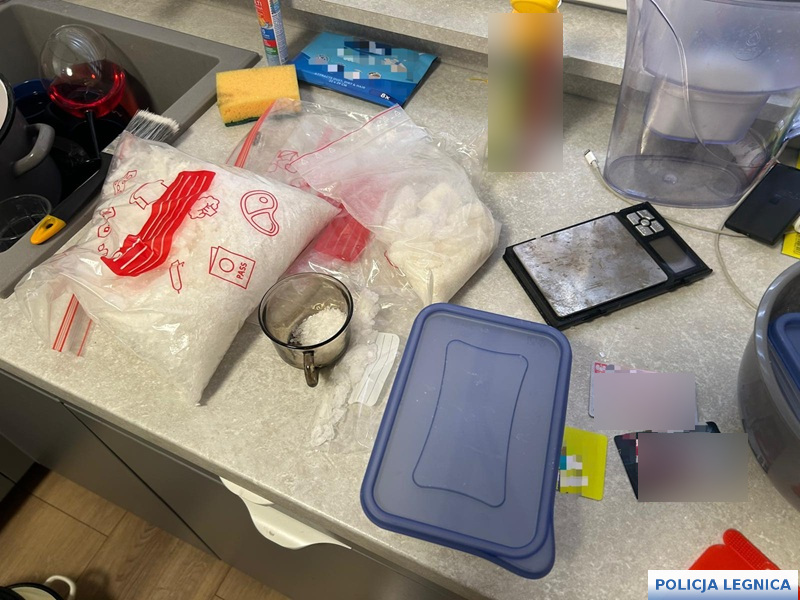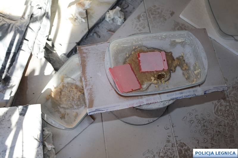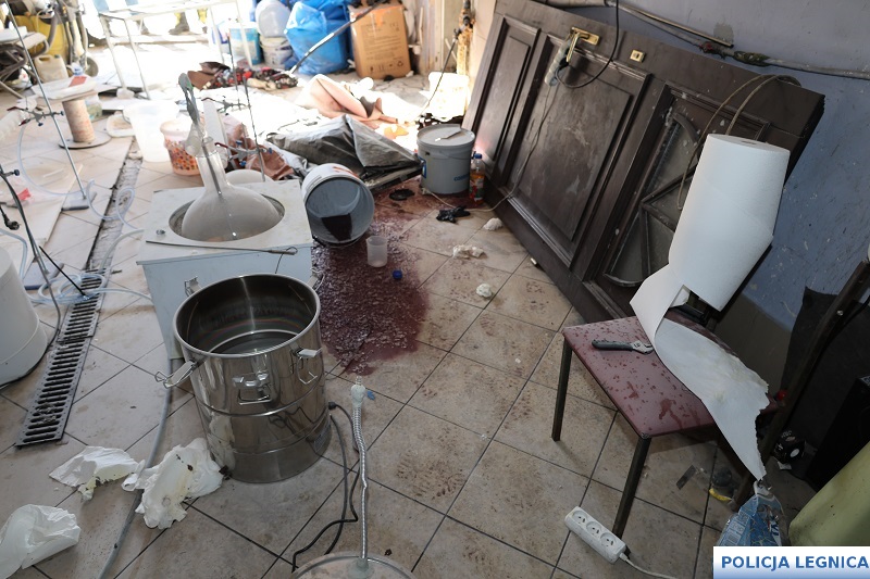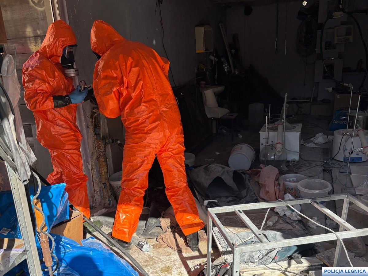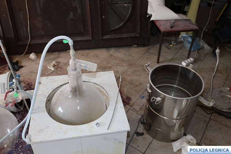 Podczas szczegółowych oględzin policjanci zabezpieczyli sprzęt laboratoryjny, w tym m.in. kolby szklane, naczynia żaroodporne, pipety, menzurki oraz liczne pojemniki z odczynnikami chemicznymi wykorzystywanymi do syntezy narkotyków. Równolegle prowadzone czynności procesowe w kolejnych lokalizacjach na terenie Legnicy oraz Lubina doprowadziły do zabezpieczenia kolejnych porcji narkotyków, sprzętu służącego do ich porcjowania, telefonów komórkowych, dokumentacji oraz gotówki mogącej pochodzić z przestępczej działalności.