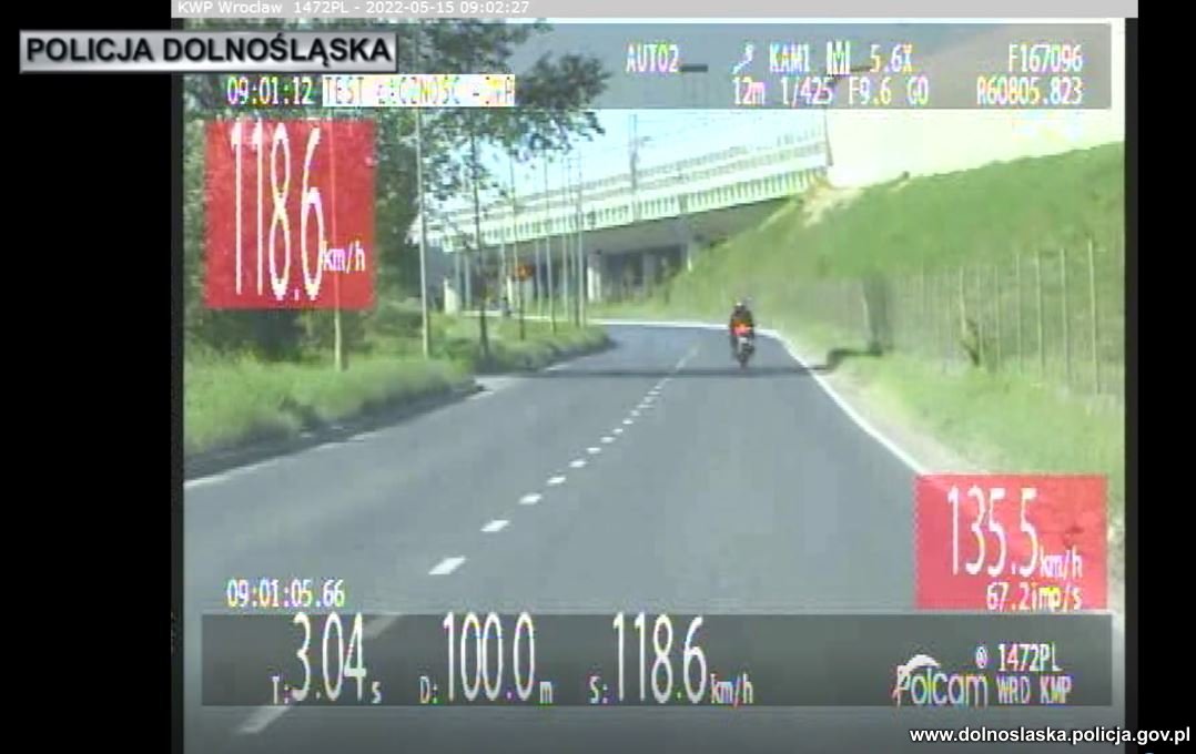 Policjanci z dolnośląskiej grupy SPEED patrolując arterie komunikacyjne Wrocławia, zauważyli motocyklistę, który przez stolicę Dolnego Śląska pędził z prędkością rozwijaną raczej na drogach szybkiego ruchu a nie w mieście. Dokonany przy użyciu wideorejestratora pomiar wykazał, że kierowca motocykla marki Suzuki jechał 118 km/h na odcinku, gdzie można poruszać się maksymalnie 50 km/h. 38-latek ewidentnie pomylił drogę publiczną z torem wyścigowym, ponieważ poza znacznym przekroczeniem dopuszczalnej prędkości, postanowił w ruchu miejskim poćwiczyć jazdę na jednym kole. Jego brawurową jazdę zakończyli funkcjonariusze ze SPEED-a, którzy zatrzymali mu prawo jazdy, dowód rejestracyjny motocykla i ukarali mandatem karnym w kwocie 2 tys. zł.