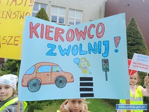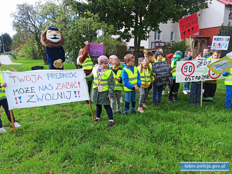 We wczorajszych działaniach na terenie Lubina udział wzięli uczniowie dwóch klas pierwszych ze Szkoły Podstawowej nr 14 w Lubinie. Dzieci samodzielnie przygotowały transparenty z pięknymi hasłami, które chwytały za serca i bardzo wzruszały kierowców. Tak „uzbrojone” przeszły razem z Komisarzem Lwem ulicami Lubina, aby wspólnie z funkcjonariuszami z ruchu drogowego uczestniczyć w informowaniu zatrzymywanych do kontroli kierowców o prowadzonej akcji promując przy tym wizję „0” - czyli ZERO wypadków drogowych. Dla kierowców taka forma kontroli była najpierw zaskoczeniem, a następnie chwilą refleksji nad ideą akcji. W akcję włączyli się też strażacy z Państwowej Straży Pożarnej w Lubinie, którzy w bardzo przystępny sposób pokazali dzieciom, jak udzielić pierwszej pomocy na przykładzie fantomów. Uczniowie mogli zobaczyć jak wyglądają podstawowe działania medyczne i udzielanie pierwszej pomocy. Strażacy pokazali dzieciom jak prowadzić resuscytację krążeniowo-oddechową, jak wezwać pomoc, jakie informacje należy przekazać, kiedy dzwonimy na numer alarmowy 112. Pokazali też, jak pomóc, gdy ktoś zakrztusi się jedzeniem. Dzieci mogły też zobaczyć sprzęt, z jakim wyruszają na akcję, aby ratować życie innych ludzi. Policjanci promując bezpieczeństwo niechronionych użytkowników dróg rozdali dzieciom kamizelki odblaskowe, aby zawsze były widoczne na drodze.